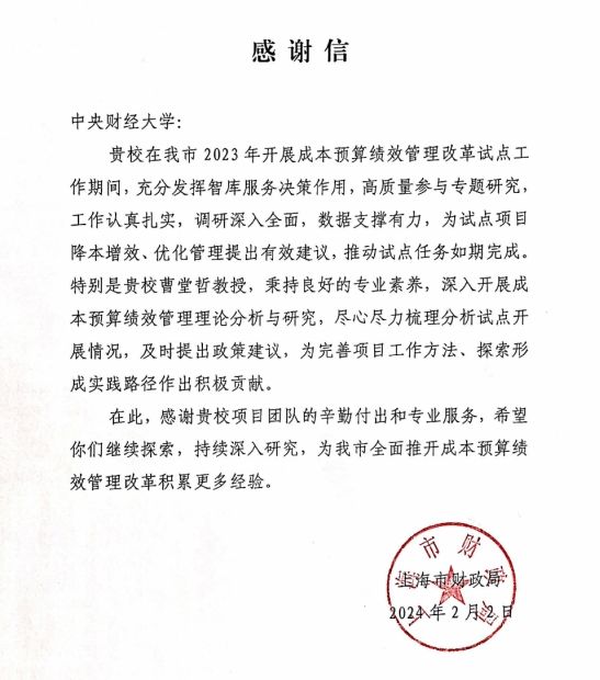 近日,上海市财政局向我校发来感谢信。来信表示,我校在上海市2023年开展成本预算绩效管理改革试点工作期间,充分发挥智库服务决策作用,高质量参与专题研究,工作认真扎实,调研深入全面,数据支撑有力,为试点项目降本增效、优化管理提出有效建议,推动试点任务如期完成。
