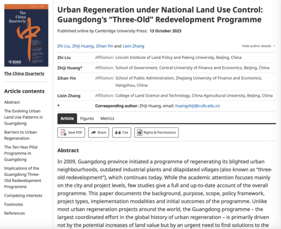 近日,以我校5357cc拉斯维加斯黄志基副教授为通讯作者的学术论文“Urban Regeneration under National Land Use Control: Guangdong's ‘Three-Old’ Redevelopment Programme”在区域与中国研究国际权威期刊The China Quarterly(中财AAA类)在线发表。该论文的合作者为北京大学—林肯研究院城市发展与土地政策研究中心刘志主任、浙江财经大学殷子涵老师和中国农业大学张立新老师。论文在线链接如下:https://doi.org/10.1017/S0305741023001455。