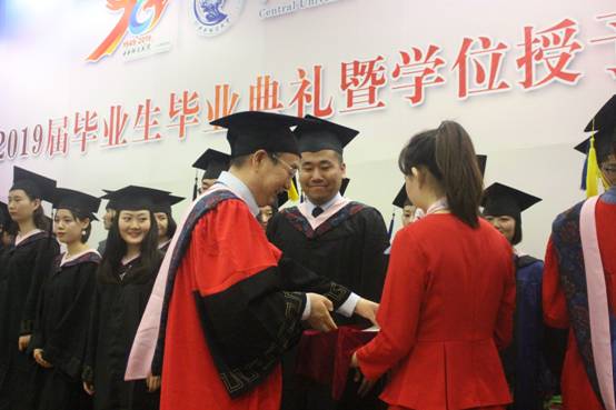 典礼进行第七项,学位授予仪式。在庄严而令人激动的乐曲声中,赵景华院长为2019届毕业生颁发毕业证书和学位证书,拨正流苏,握手并合影留念。深深鞠躬,感恩您谆谆教导;流苏拨正,愿你前路一片坦荡。