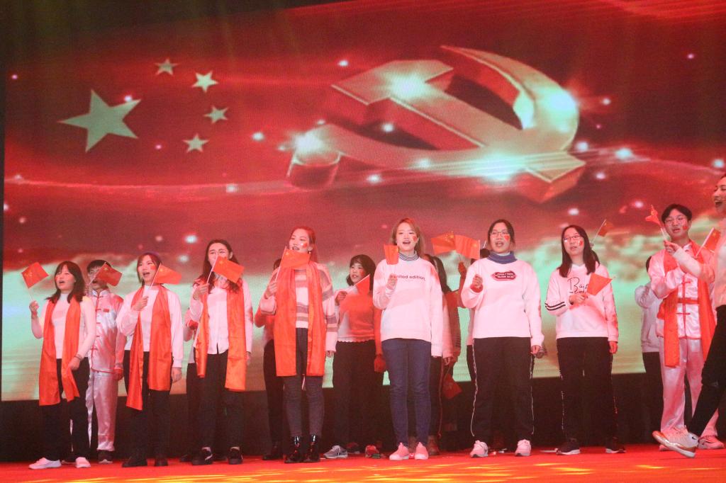联欢会最后一项节目是由国庆广场合唱团成员、“春潮滚滚”方阵成员、演职人员代表共同带来的大合唱《不忘初心》。大合唱《不忘初心》将每个人的爱国情怀调动起来,全场气氛升华到最高。红日初升,其道大光,河出伏流,一泻汪洋,我政管学子定将不忘初心、牢记使命,书写我们的青春芳华。