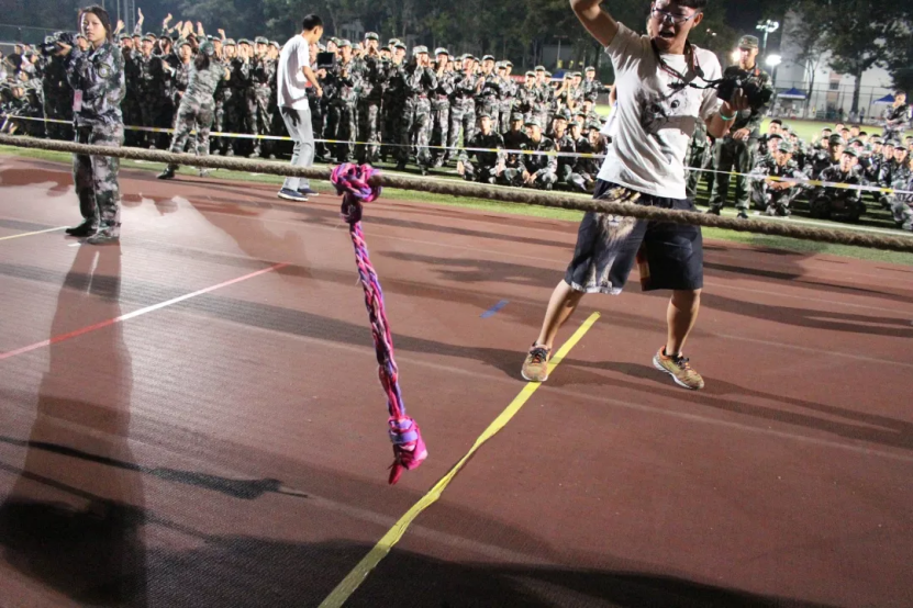 在9月4号晚上的决赛中,政管学子与三营会计学院新生对战,双方队员全力以赴。快门声、鼓掌声、呐喊声充盈着整个赛场。凭借着团结的精神和钢铁般的意志,25名政管学子团结一致,最终两次战胜三营选手,以2比0的成绩获得2019年本科生军训拔河比赛冠军。