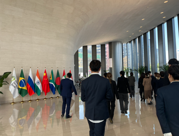 2024年11月27日,中央财经大学国际组织人才培养实验班(Global Competences Development Program,简称GCDP)师生代表14人受邀参访金砖国家新开发银行。本次参访是国际组织人才培养实验班模块制培养计划 “研学活动模块”内的活动,旨在通过实地参访帮助GCDP学生更好了解发展中国家主导运营的国际多边开发银行,更坚实地树立为全球发展治理贡献力量的愿景。同学们对此次参访十分期待,希望能在交流对话中更深入了解新开发银行业务、组织与运营,为个人发展融入国家发展、全球发展提供启示和新思路。